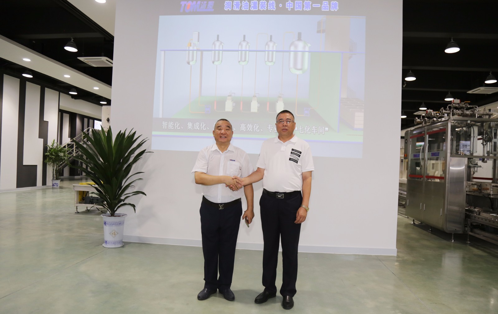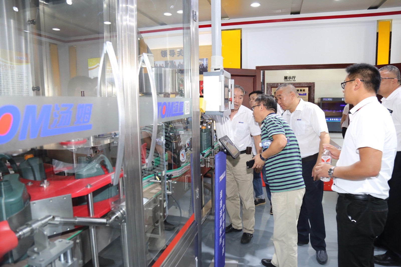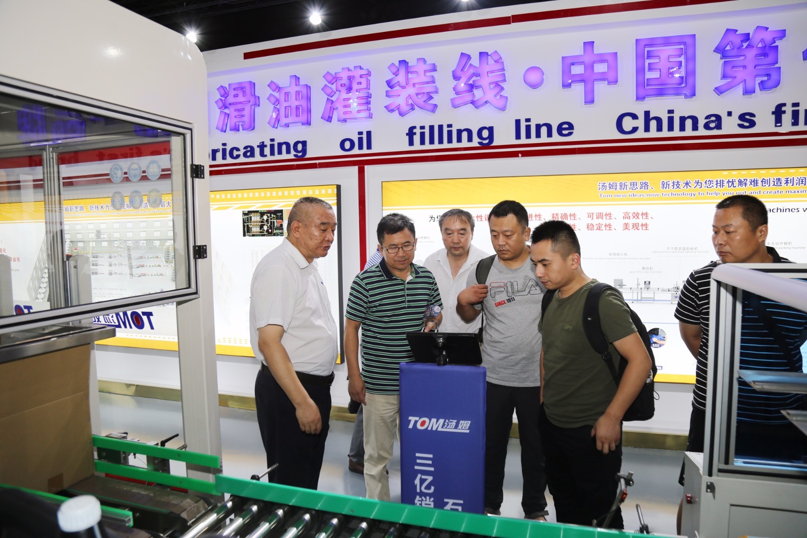 江蘇湯姆集團代表在介紹公司潤滑油灌裝線