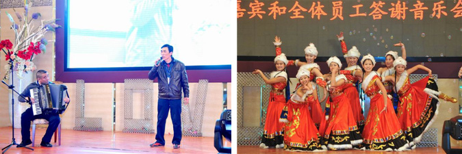 “2011年銷售突破億元(10656萬元)”湯姆嘉賓和全體員工答謝音樂會,湯姆董事長湯建華為湯姆員工芮正春演唱的《我的老婆并不美》作手風琴伴奏(左圖);常州幼兒師范學校舞蹈隊為湯姆公司獻上民族舞《唐古拉》(右圖)
