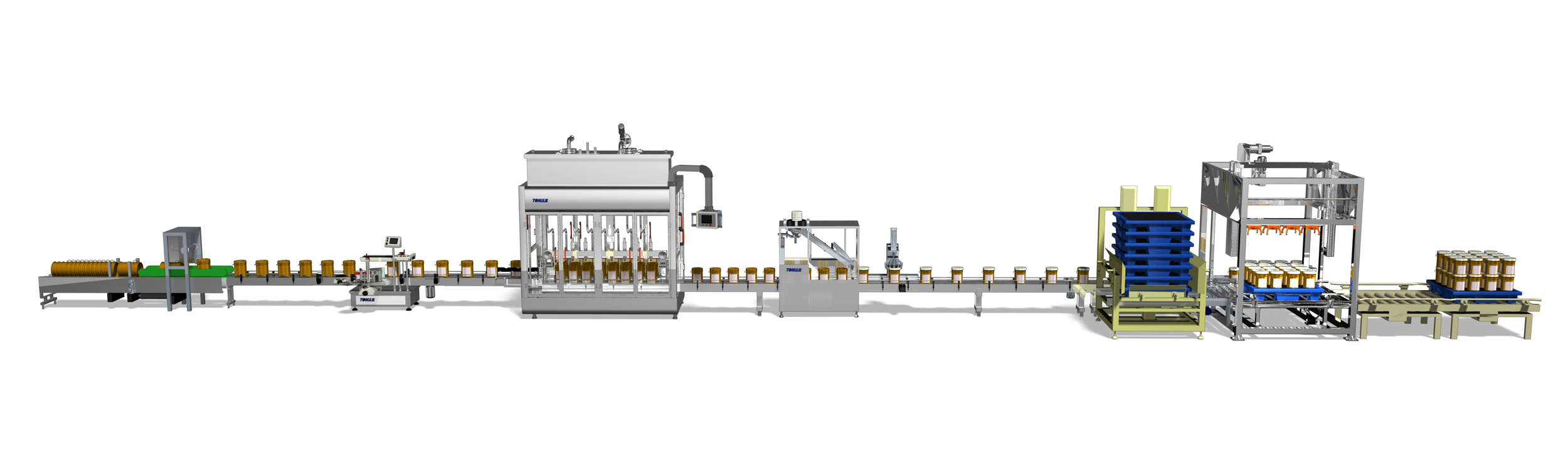 此條生產(chǎn)線設備配置:進桶機、全自動上稱重式灌裝機、全自動封蓋機、開箱機、裝箱機、封箱機、機器人碼垛機、自動捆扎與纏繞機。